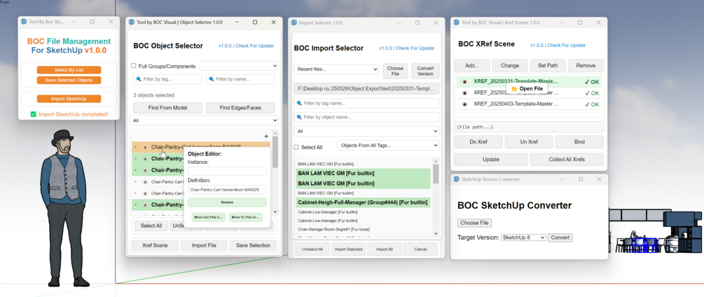 - Xref Scene: Visually link and manage external SketchUp files (Xrefs). You can break the master model into parts so each teammate works independently. Once done, all the parts can be updated back into the master file — safely and without overlap. Ideal for dividing workload, tracking project progress, and managing updates cleanly.